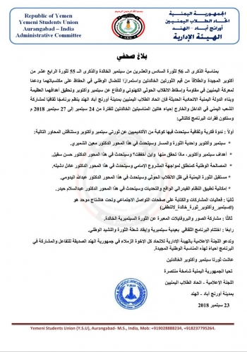 اتحاد الطلاب اليمنيين اورنج آباد الهند ينظم أسبوع ثقافي لإحياء ذكرى ثورتي سبتمبر...