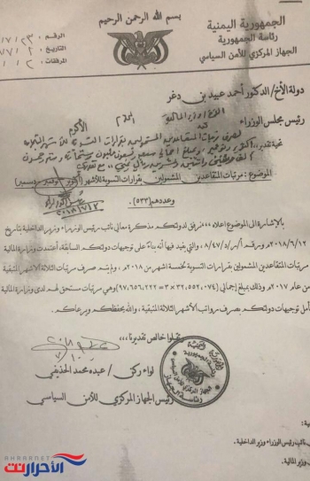 شاهد وثيقة تكشف حقيقة توجيه رئيس الوزراء بصرف مرتبات متقاعدي الأمن السياسي...