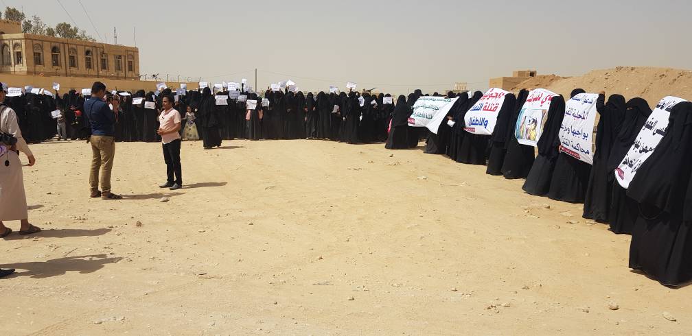 وادانت الوقفة استهداف المدنيين من النساء والأطفال بعرس زواج احد النازحين بمدينة الحزم عاصمة المحافظة..مطالبين الامم المتحدة ومنظمات حقوق الانسان بانقاذ المواطنيين العزل والمناطق السكنية من استهدافهم بالقذائف والصواريخ التي راح ضحيتها العشرات من النساء والأطفال.