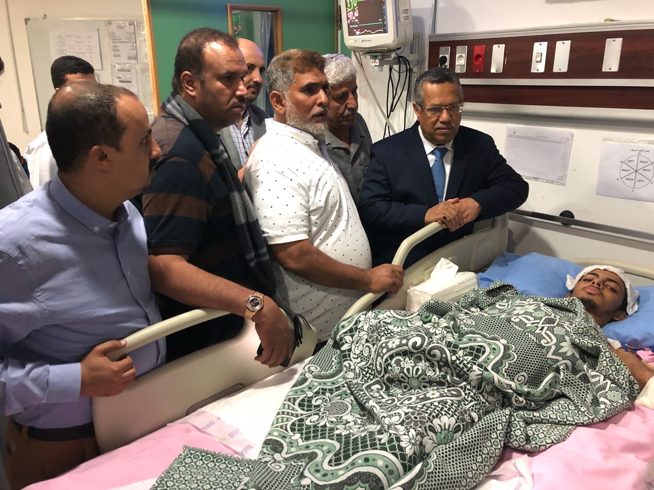 قام رئيس الوزراء، الدكتور أحمد عبيد بن دغر، اليوم، بزيارة تفقدية للجريح أحمد عارف محمد الذي جرح أثناء تعرض والده أمين سر رابطة الأطباء بعدن والقيادي في حزب الإصلاح الدكتور عارف أحمد علي لمحاولة اغتيال في عدن بتفجير سيارته بعبوة ناسفة.