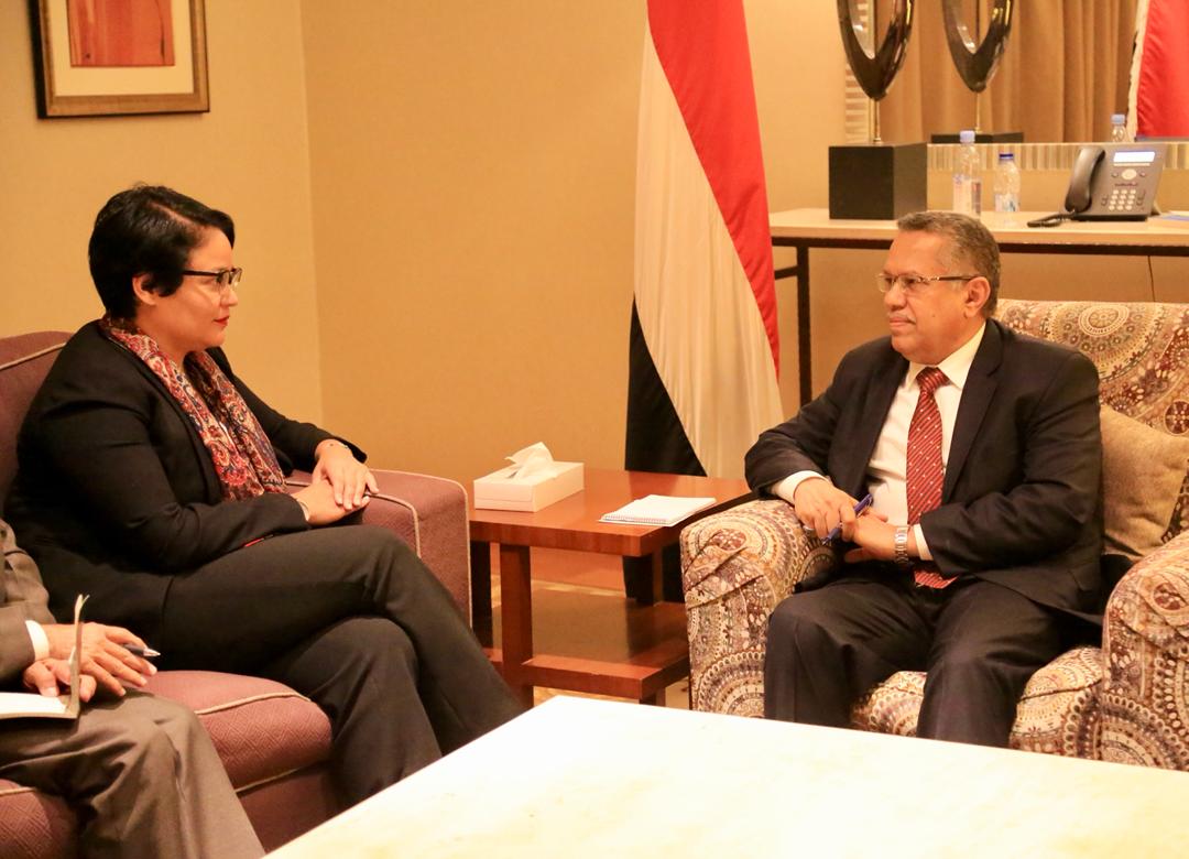 جاء ذلك خلال لقائها برئيس الوزراء الدكتور أحمد عبيد بن دغر، وناقشا معا الأوضاع الراهنة، والمستجدات الجارية فيما يتعلق بالتدهور الاقتصادي وانهيار العملة.