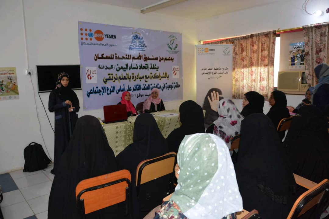 نظم اتحاد نساء اليمن بالشراكة مع مبادرة بالعلم نرتقي ،اليوم، في العاصمة المؤقتة عدن ،حلقة توعية حول مناهضة العنف القائم على أساس النوع الإجتماعي بدعم من صندوق الأمم المتحدة للسكان.