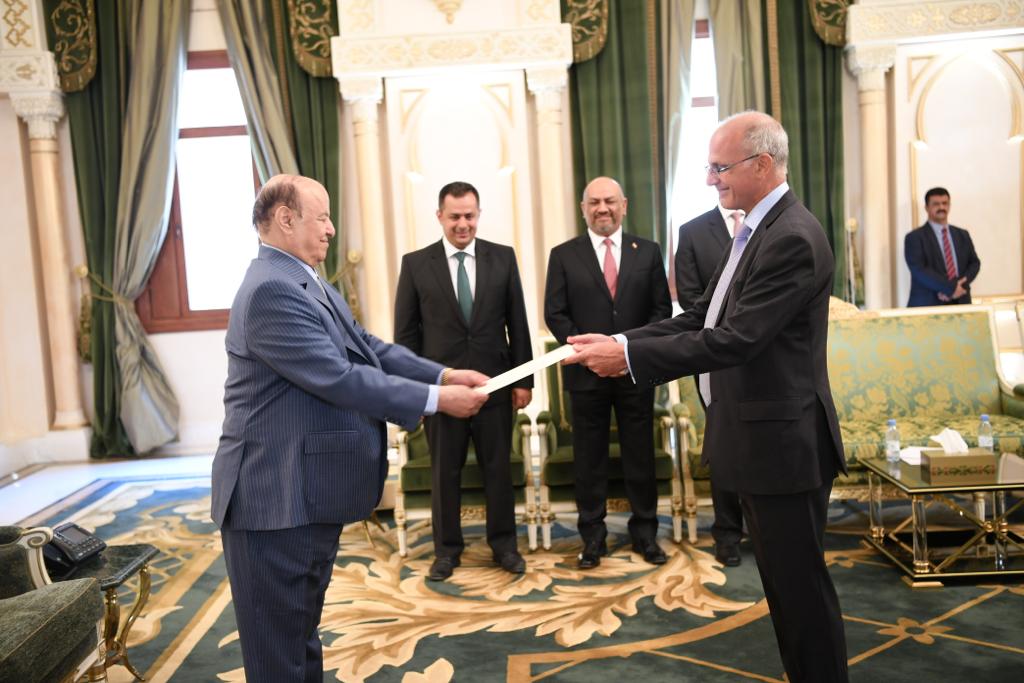تسلم فخامة الرئيس عبدربه منصور هادي رئيس الجمهورية صباح اليوم أوراق اعتماد مايكل أرون سفير المملكة المتحدة لدى بلادنا.