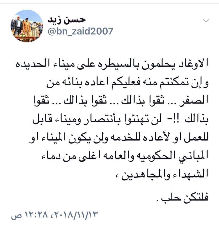 وقال الزعيم الشيعي في الميليشيا الإرهابية الإيرانية الانقلابية إن على الشعب اليمني إعادة بناء الميناء لو أراد تحرير الحديدة وميناءها من تحت ربضة احتلال جماعته المؤتمرة والمرتهنة لطهران.