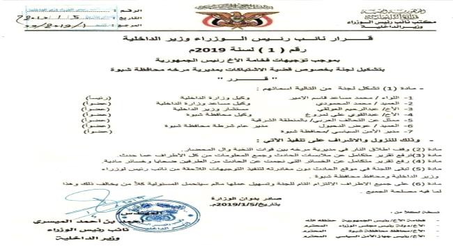 ونص القرار على أن تبقى اللجنة في موقع الحادث دون مغادرته لتنفيذ التوجيهات اللاحقة من نائب رئيس الوزراء وزير الداخلية ومحافظ شبوة.
