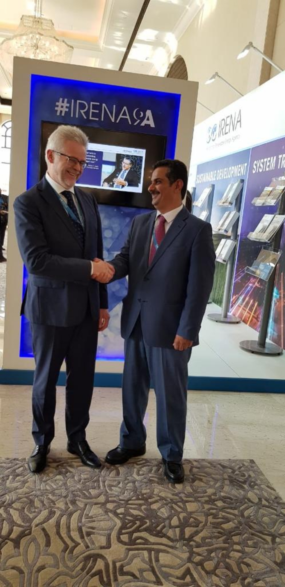وفي سياق متصل تراس الوزير العناني وفد بلادنا المشارك باعمال المؤتمر العالمي للجمعية العمومية التاسعة للوكالة الدولية للطاقة المتجددة (ايرينا)في ابوظبي حيث شارك في المؤتمر رؤوسا دول وحكومات مايزيد عن 120 وزيرا وهو اكبر عدد من المشاركين على المستوى الحكومي في تاريخ الحدث.