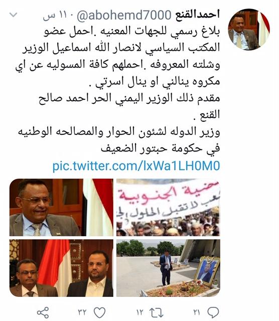وقال القنع في منشور على صفحته الرسمية في فيسبوك: "بلاغ رسمي للجهات المعنية.. أحمل عضو المكتب السياسي لأنصار الله (الحوثيين)، اسماعيل الوزير وشلته المعروفة.. أحملهم كافة المسؤولية عن أي مكروه ينالني أو ينال أسرتي" .