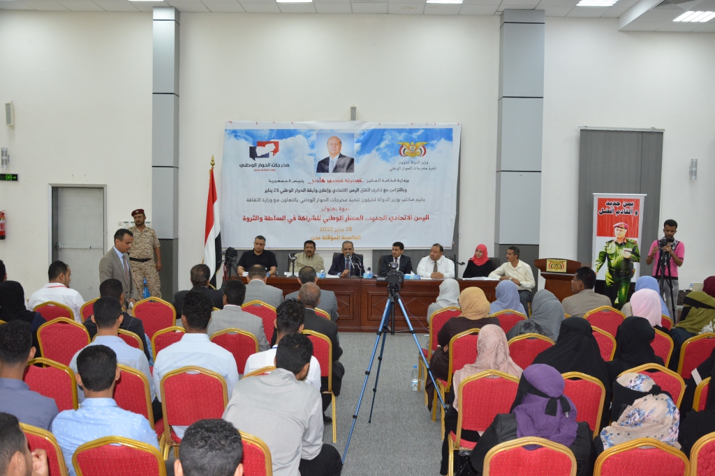 وقدمت في الندوة عدد من أوراق العمل، ركزت ورقة العمل التي قدمها وزير التربية والتعليم الدكتور عبد الله لملس، تحت عنوان: "مؤتمر الحوار.. التوافق الوطني من أجل يمن جديد"، على مخرجات الحوار الوطني كمشروع سياسي واجتماعي ونظام عدالة اجتماعية يضمن للجميع الشراكة في السلطة والثروة.