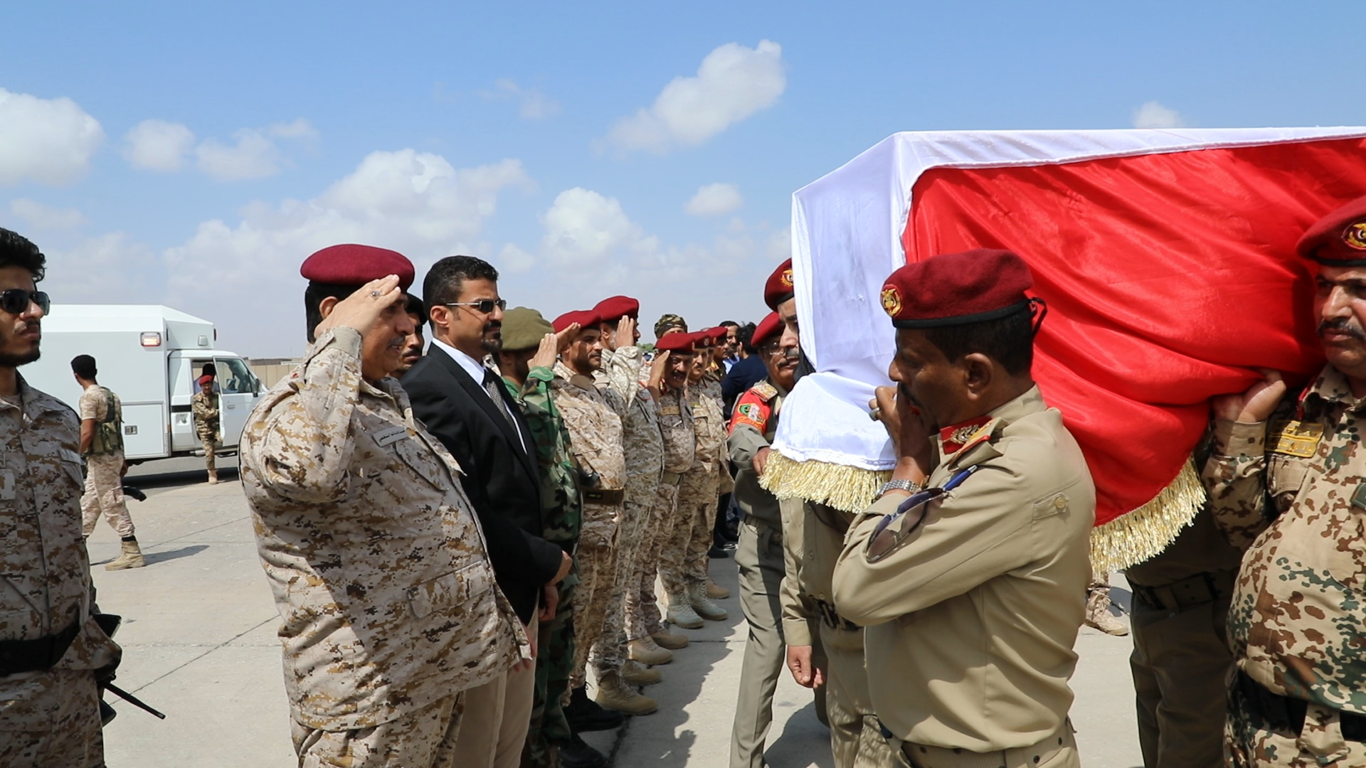 ومر جثمان الشهيد الملفوف بالعلم الجمهوري، محمولا على اكتاف القيادات العسكرية وسط حرس الشرف الذين اصطفوا لتحية الشهيد.