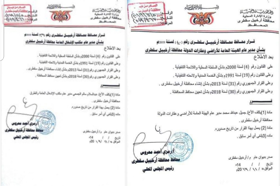 أقال محافظ ارخبيل سقطرى رمزي محروس اليوم الخميس مديري مكتب الاشغال وهيئة الاراضي في المحافظة.