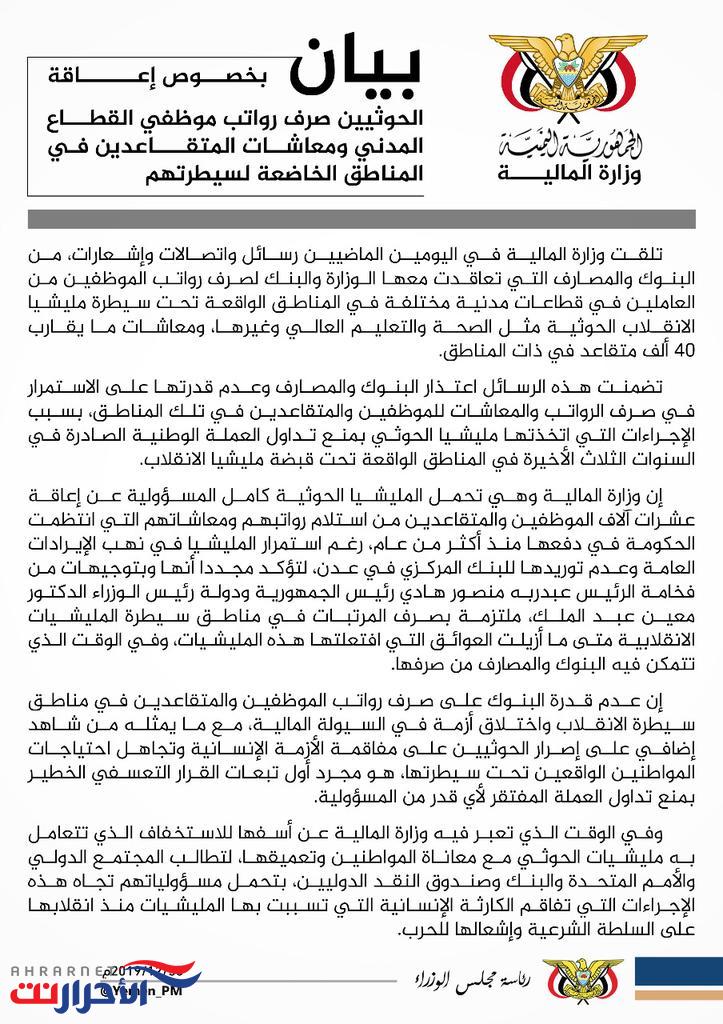 ‏إنفوجرافيك | وزارة المالية: إجراءات مليشيا ‎#الحوثي غير القانونية بمنع تداول العملة الوطنية تتسبب في حرمان عشرات الآلاف من الموظفين والمتقاعدين من استلام رواتبهم ومعاشاتهم التي انتظمت الحكومة في دفعها.